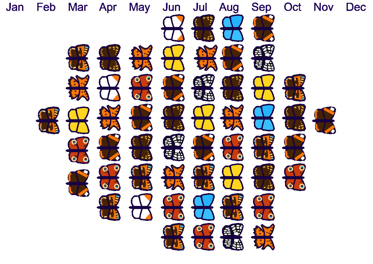 So when can you find these and other British butterflies in the wild? First of all you need a warm or hot sunny day with little or no wind. After that its down to the month, the terrain and aspect of slope. Blues for instance fly only on South facing chalk terrain. There is not room to give you all the information, but the pictogram below may help.