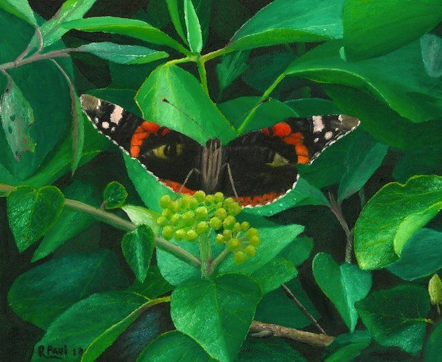 I'd never seen this in a red admiral before. Look online or in the books and they show the wings from above, or rarely a glance of the underside but with only a hint of greeen in a partly folded wing. Here though I caught the full underside as the butterfly was feasting on ivy in late Autumn. The full wing shows what looks like a convincing pair of eyes.