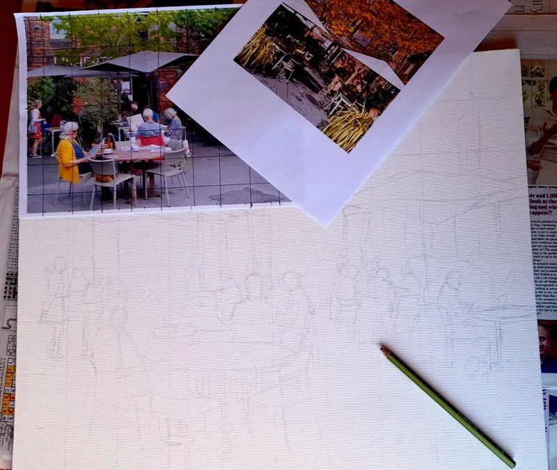 Like all my more complex paintings, I start with a grid and map out the key parts in pencil.