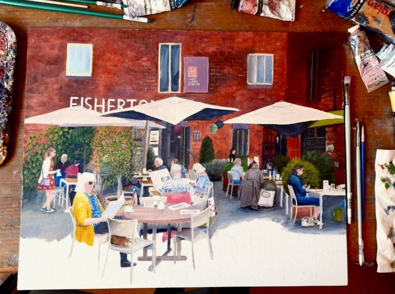 To finish I borrowed two planters from a second source photo, to reduce the amount of grey tarmac showing. To bed them down in the painting I darkened the area around the base of the pots, just as I have around each chair leg and foot.
